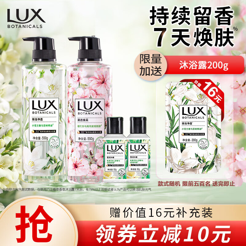¥56.9 力士(LUX)植萃精油香氛沐浴露套装小苍兰550g+樱花550g赠50gx2持久留香茶树 66.9