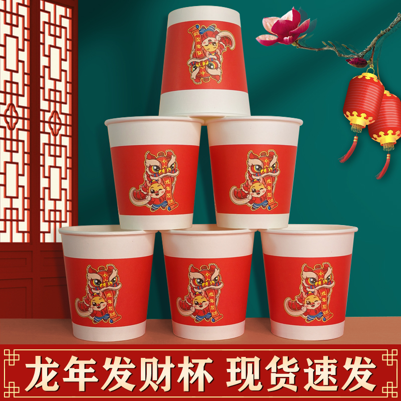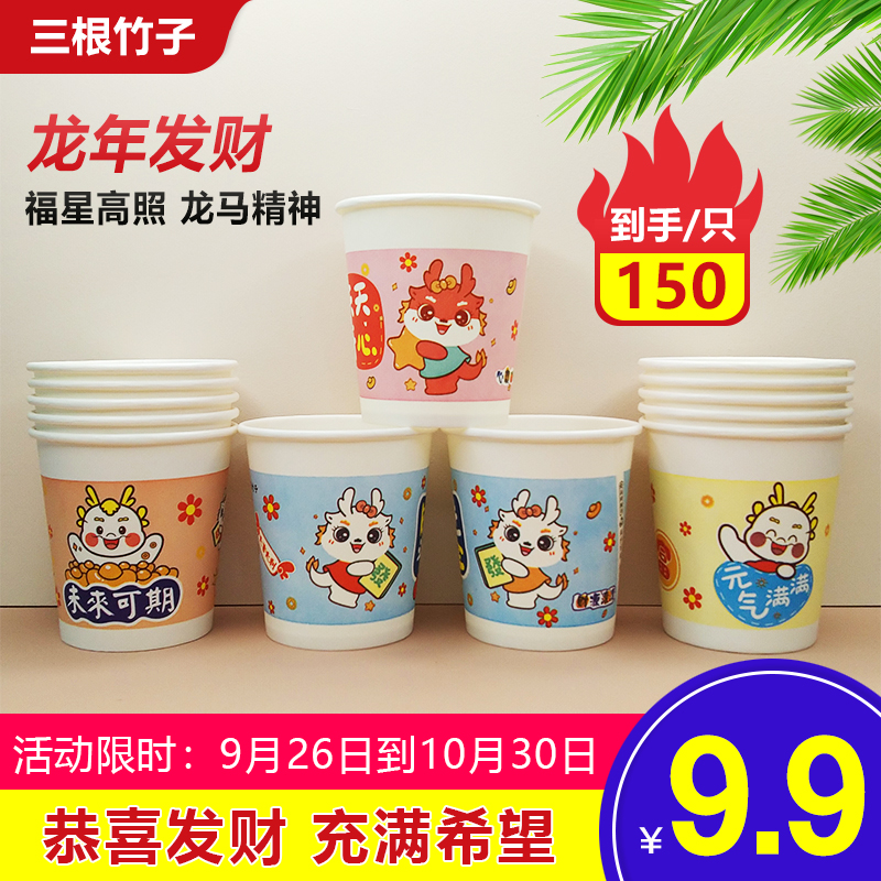 实付9.9元,【龙年发财】【到手150只】一次性纸杯 龙年纸杯国潮可爱家用茶水杯子