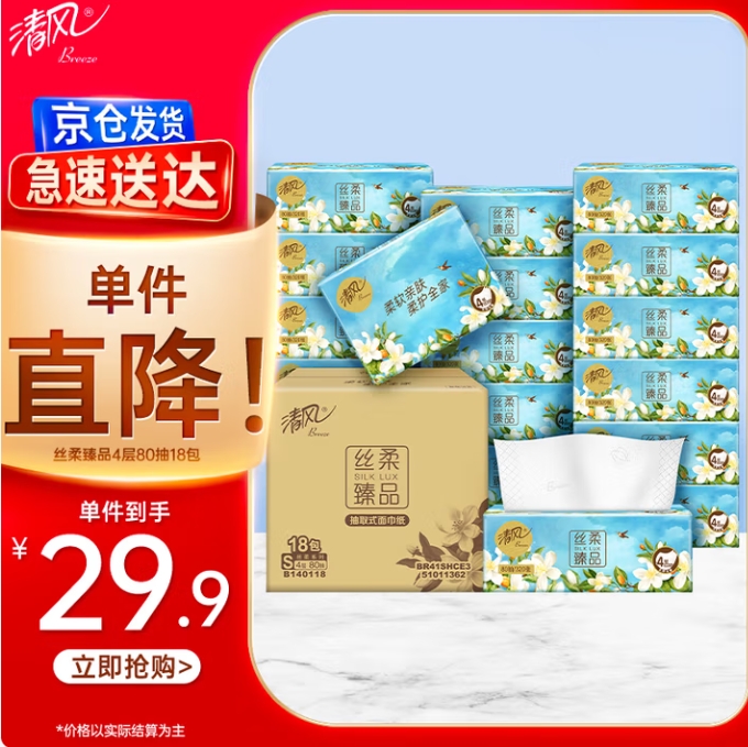 25.5元!维达棉韧压花抽纸3层100抽30包S码