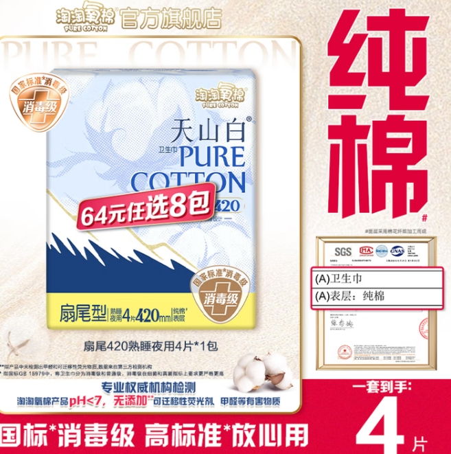 4.58元!淘淘氧棉 天山白消毒级卫生巾