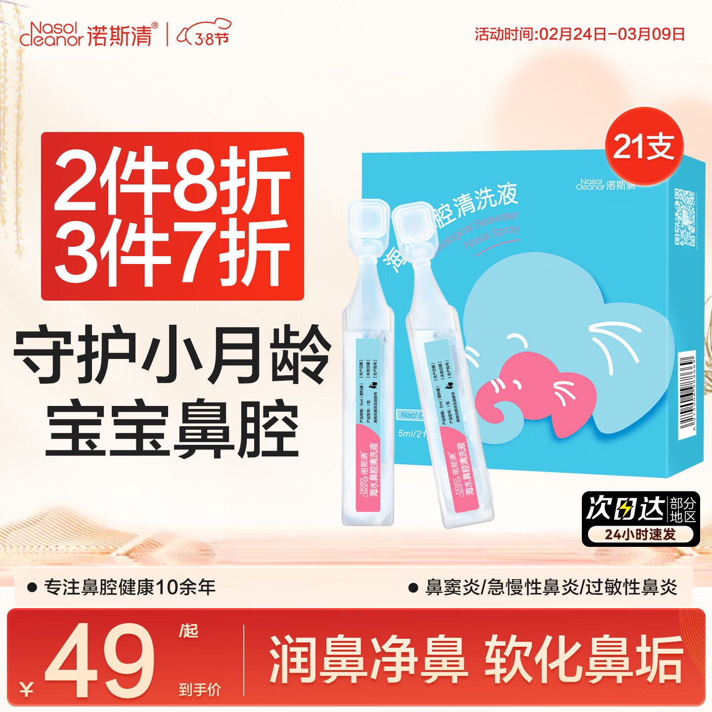 诺斯清生理性海盐水次抛滴鼻液 5ml*21支 仅19.9元!