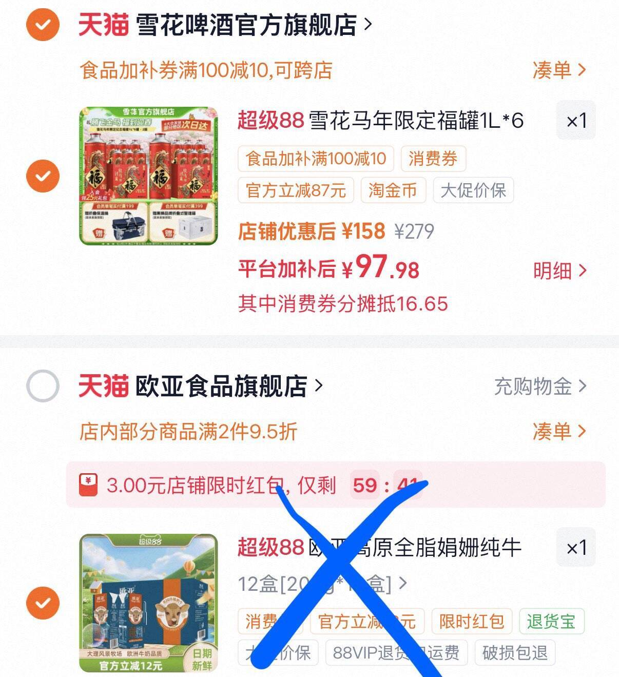 雪花啤酒1L*12罐加赠全麦5号,凑单后低至约74.5元