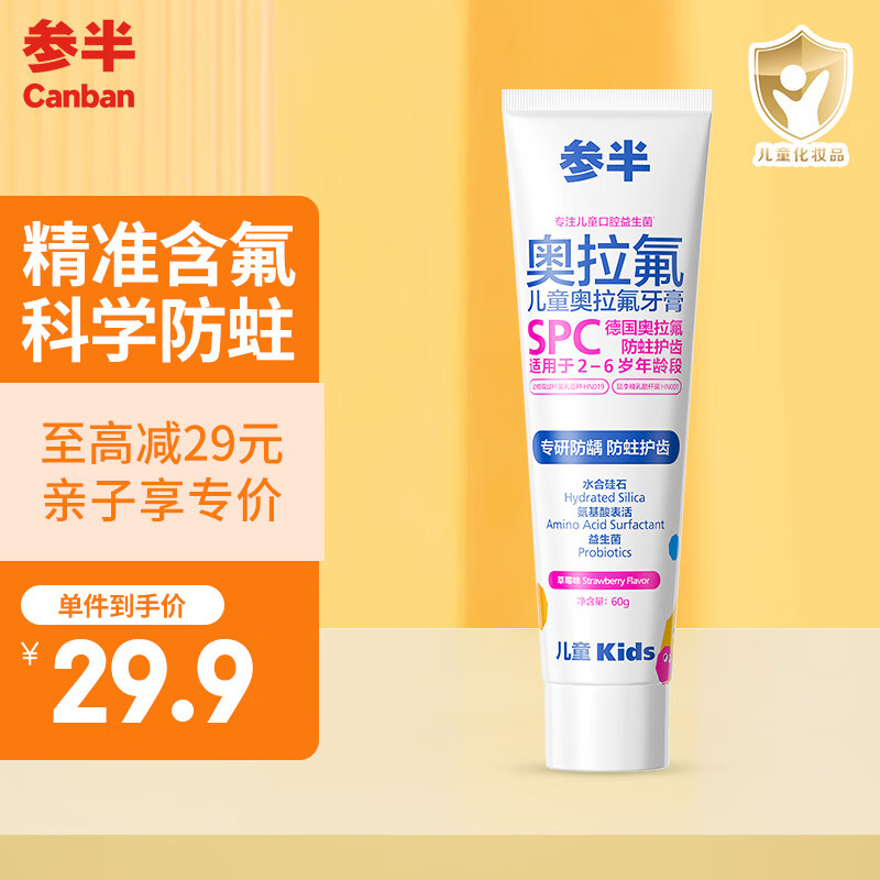 ¥34.9 参半(NYSCPS)儿童奥拉氟牙膏 奥拉氟含低氟防蛀防龋齿2-6岁换牙期草莓味60g 39.9