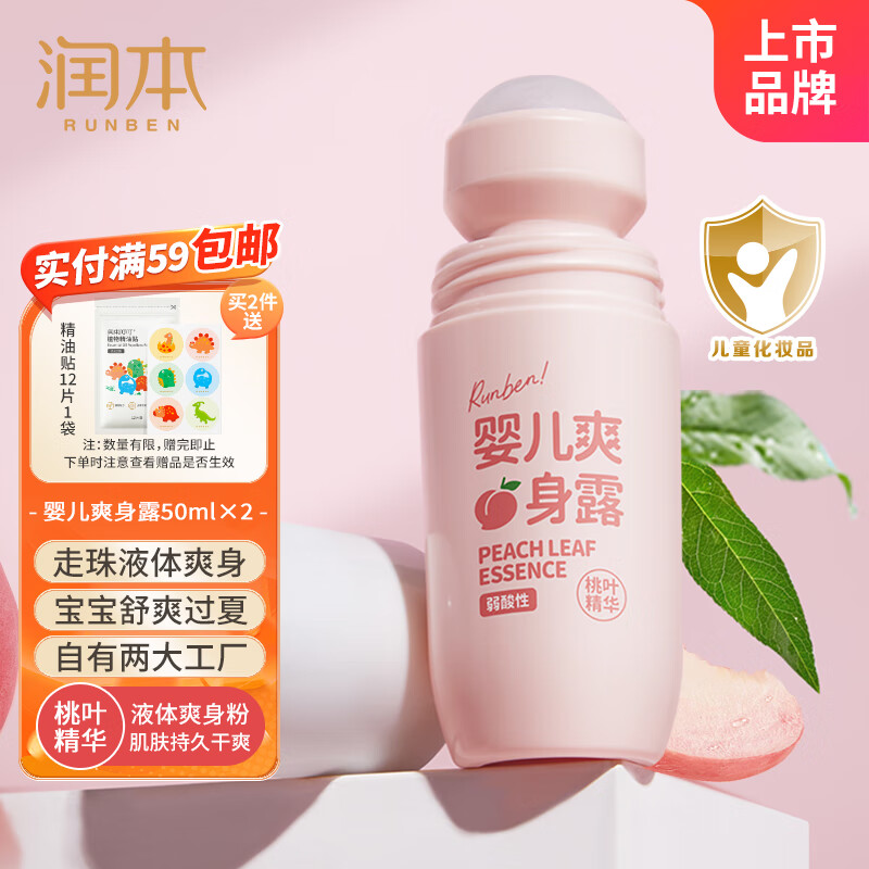 ¥19.8 润本(RUNBEN)婴儿液体爽身露粉50mlx2瓶(桃叶精华)宝宝痱子水 爽身粉婴儿 34.8