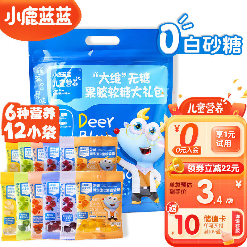 ¥39.9 小鹿蓝蓝无糖营养软糖12袋 6重营养含钙铁锌DHA叶黄素儿童糖果 61.9