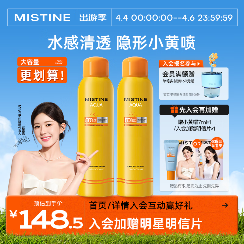 ¥118.5 Mistine(蜜丝婷)小黄喷防晒喷雾180ml*2 男女便携补喷防水防汗军训必备 148.5