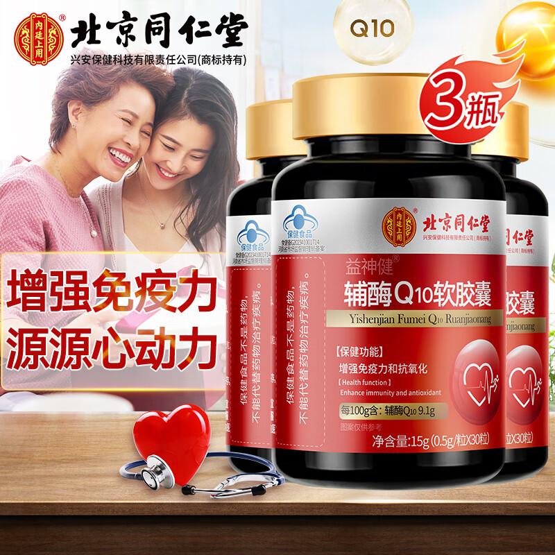 ¥112 北京同仁堂 辅酶q10软胶囊 辅酶q10 增强免疫力成人中老年人抗氧化可搭保护心脏增强心肌动力保健品 【0.5g*30粒】*3瓶 156