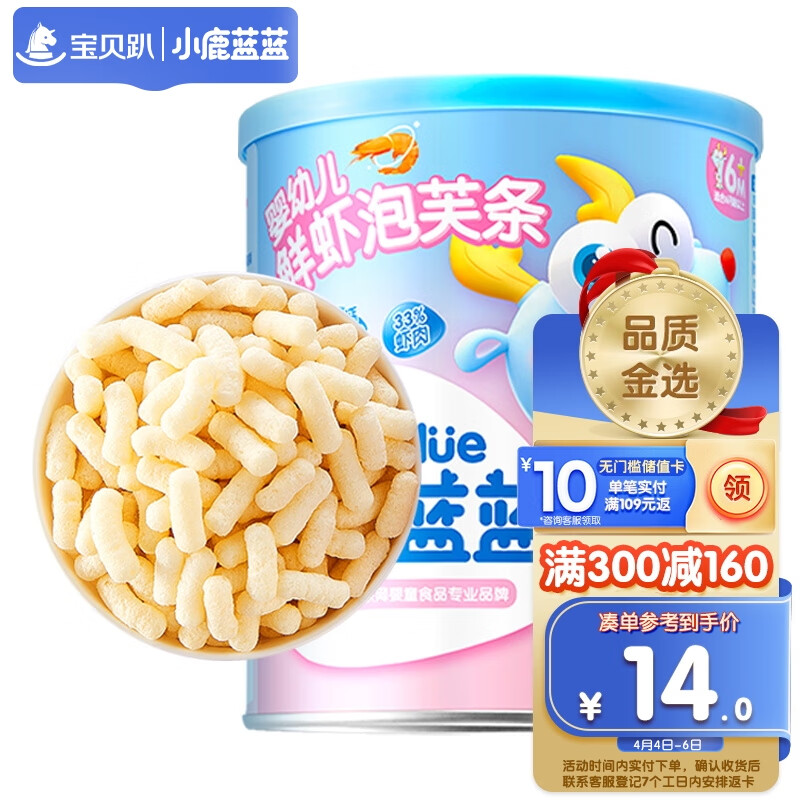 ¥19.9 小鹿蓝蓝婴幼儿泡芙条鲜虾味 6月宝宝零食手指泡芙辅食条 42g 29.9