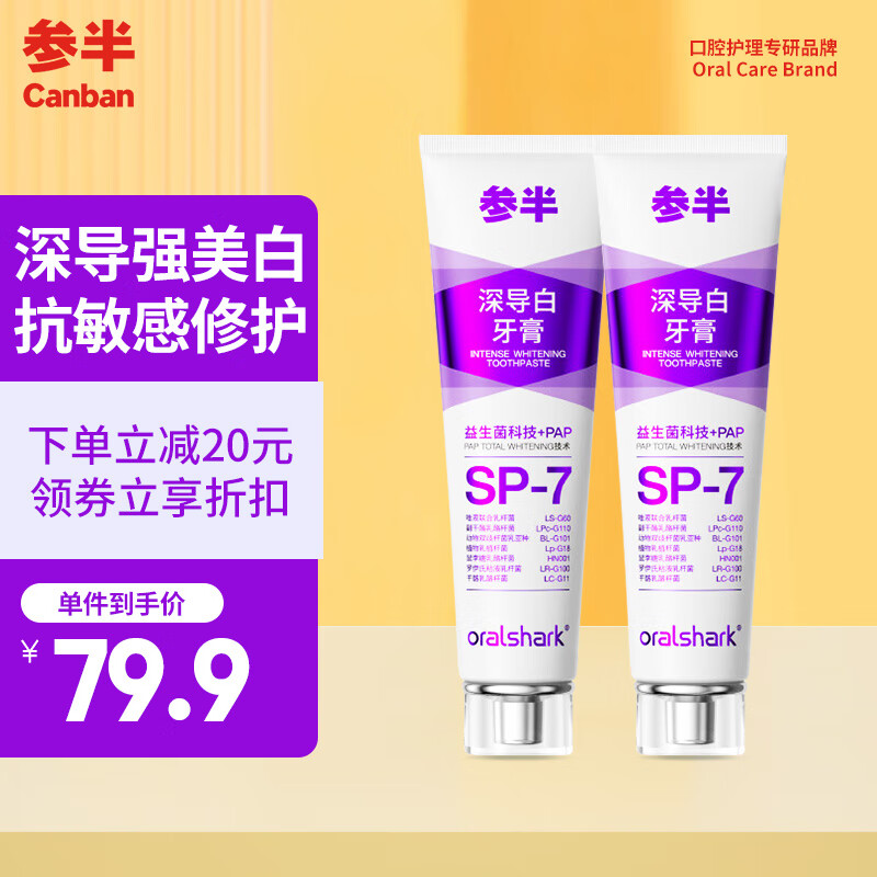 ¥94.9 oralshark口腔鲨鱼深导白美白牙膏 益生菌洁净口腔去渍清新增白2支240g国货 99.9