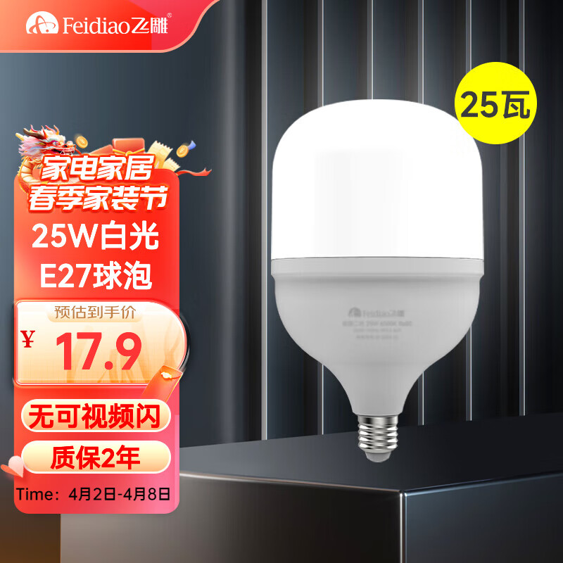 ¥10.9 飞雕LED灯泡柱泡节能灯 E27大螺口家用商用功率光源超亮白光球泡 25W白光|E27大螺口 17.9