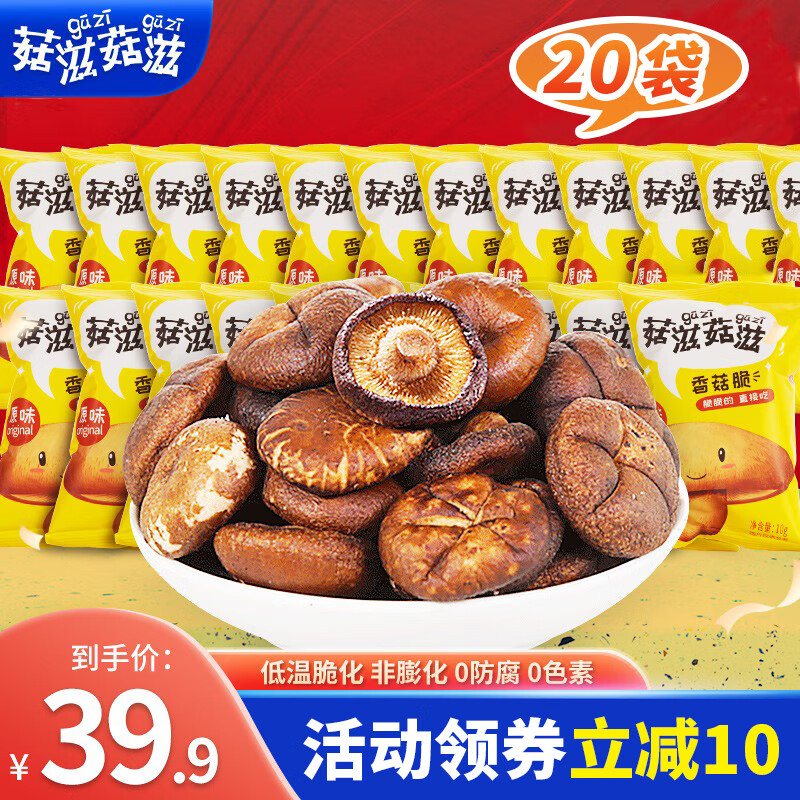 ¥29.9 菇滋菇滋(guziguzi) 香菇脆开袋即食蘑菇干蘑菇脆干脆香菇片办公室休闲零食 10g 20袋 香菇脆 原味 49.9