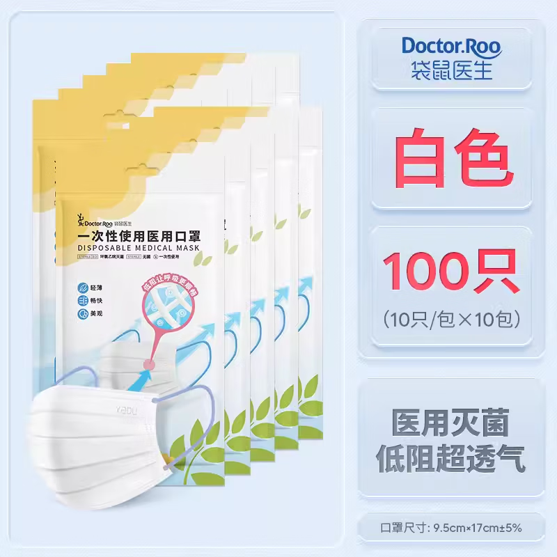 ¥7.9 袋鼠医生“空气口罩”一次性医用低阻透气秋季三层防护男女通用白色 白色100只(灭菌) 27.9