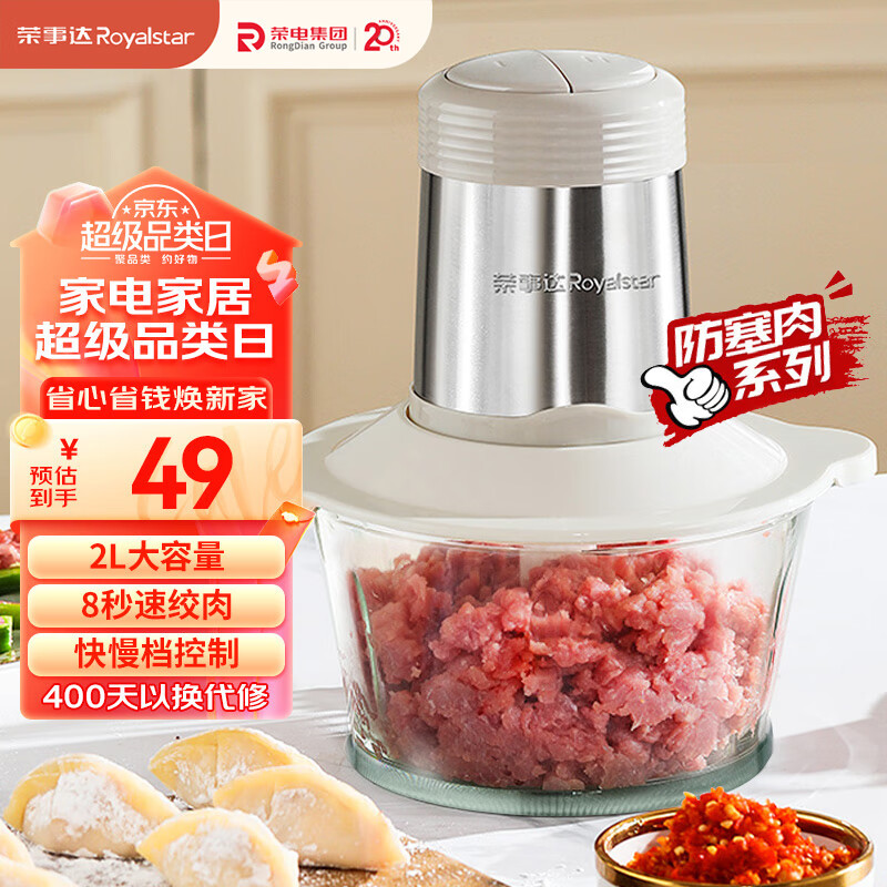 ¥49 荣事达(Royalstar)绞肉机家用电动多功能料理机切菜婴儿辅食机碎肉搅肉机饺子肉馅蒜蓉机RS-JR30R5【玻璃碗1副刀】 59
