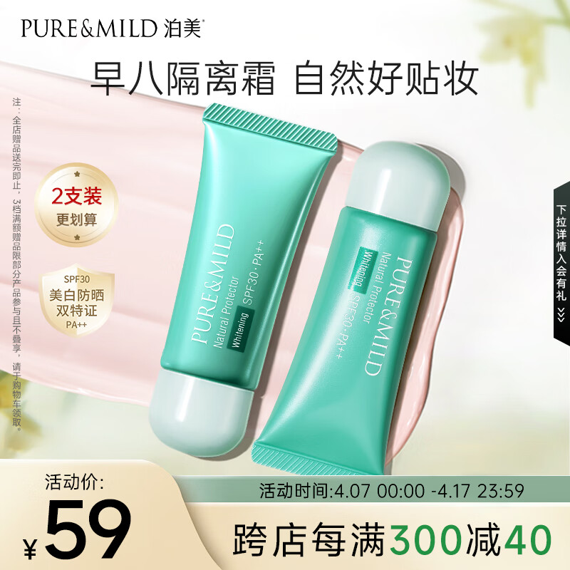 ¥49 泊美植物清盈小绿伞防晒美白隔离霜妆前乳40g*2/支(水润遮瑕) 送女友 59