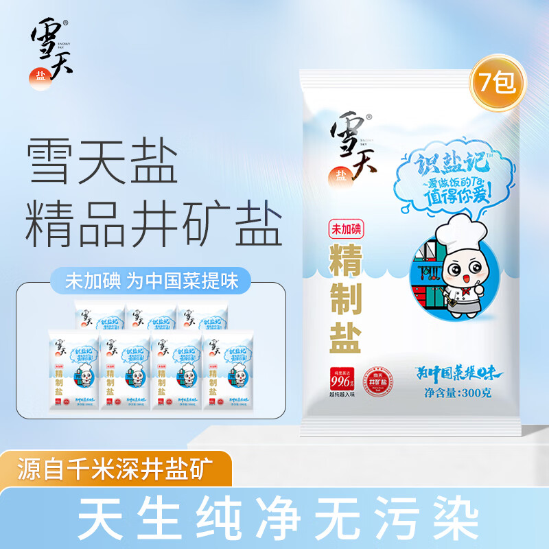 ¥5.9 雪天(xuetian)【7包刚刚好】识盐记未加碘加碘精制食用盐无碘家用细盐调味品 未加碘精制盐300g*7包 7.9