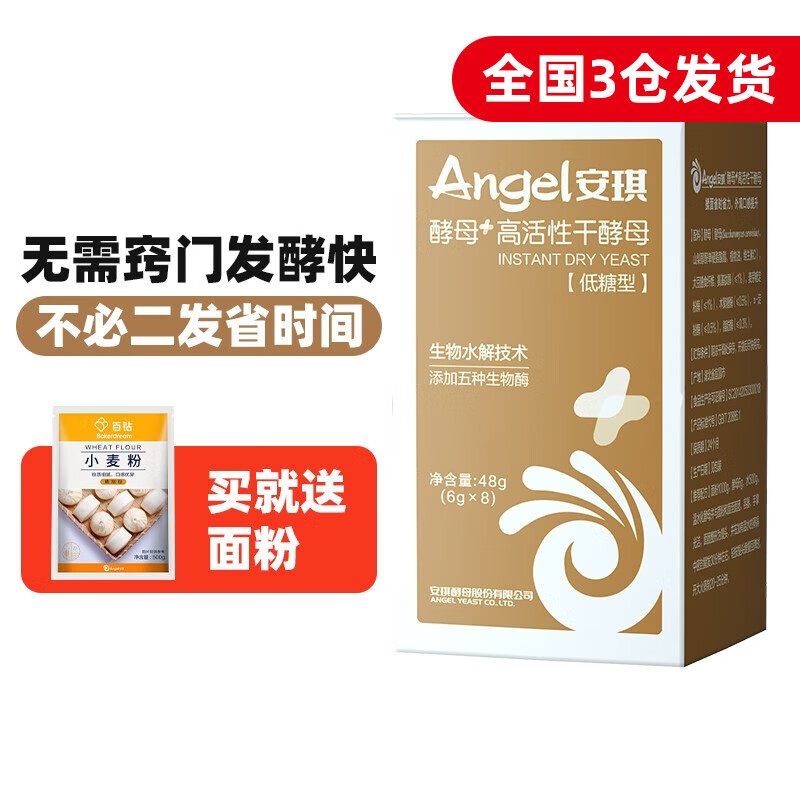 ¥9.9 安琪(Angel)新一代酵母 低糖型高活性干酵母粉发面家用做包子馒头专用发酵粉 6g *8袋+面粉500g 14.9