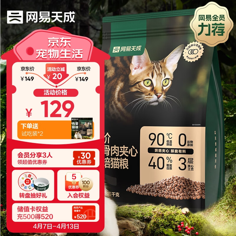 ¥119 网易天成宠物主粮幼猫成猫全价生骨肉夹心烘焙猫粮 1.5kg 129