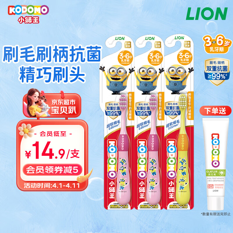 ¥35.9 狮王(Lion)小狮王儿童抗菌牙刷3-6岁*3国产 细软毛牙刷粉色*2+黄色*1 45.9