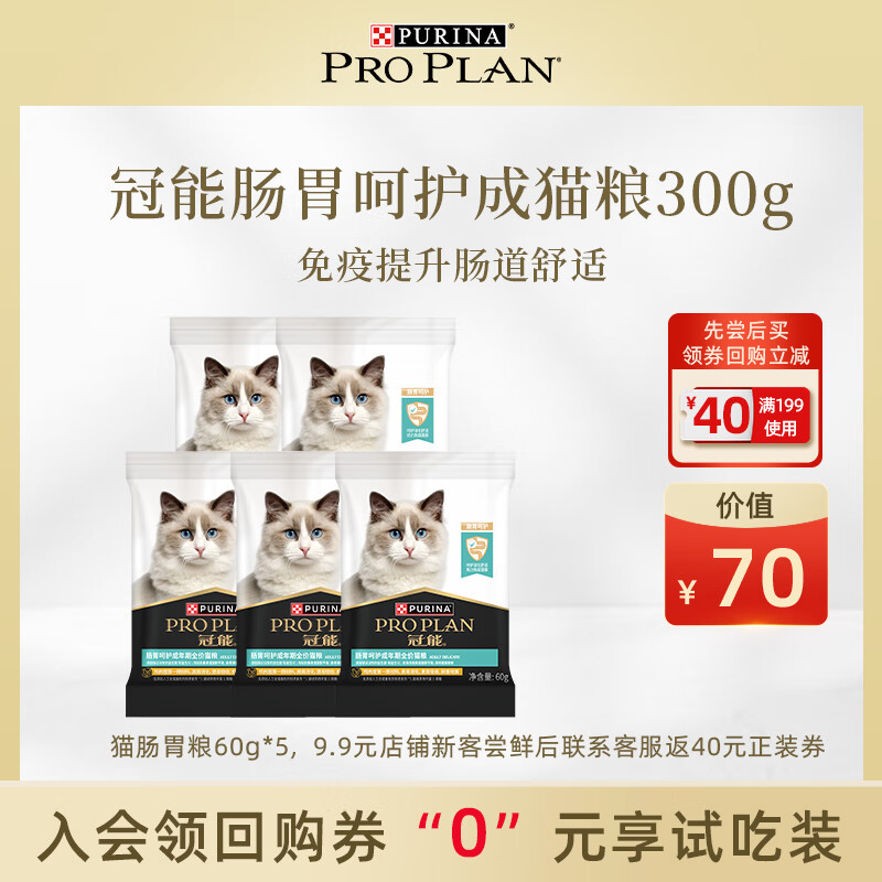 ¥9.9 冠能猫粮胃肠呵护成猫猫粮营养高消化助吸收 小包试吃60g*5包 24.9