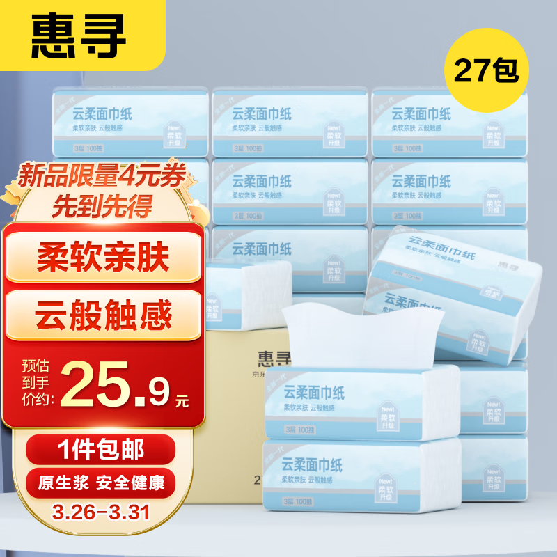 ¥25.9 惠寻抽纸 云柔纸巾 3层100抽*27包 卫生纸 餐巾纸擦手纸 29.9