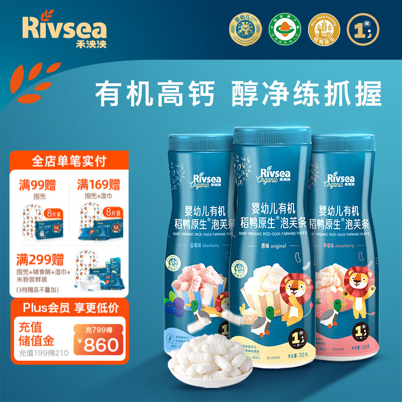 ¥102.4 禾泱泱有机婴幼儿泡芙条 宝宝零食6个月以上 高钙锻炼抓握 有机稻鸭原生泡芙条3罐(原味+蓝莓+草莓) 119.4