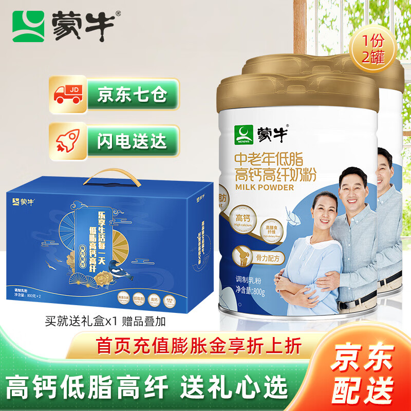 ¥123.3 蒙牛(MENGNIU) 中老年低脂高钙高纤奶粉800g/罐轻盈骨力成人奶粉送父母长辈过年 2罐【礼盒装】 128.3
