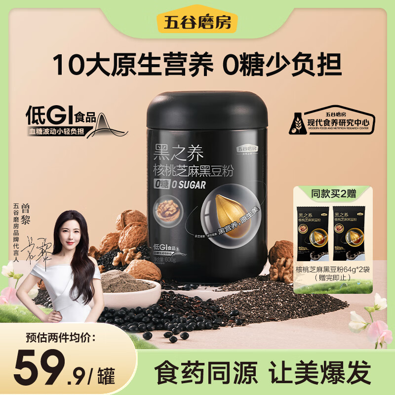 ¥59.9 五谷磨房 黑之养 无糖核桃芝麻黑豆粉黑芝麻糊代餐粉营养早餐黑米黑藜麦黑大豆奇亚籽600g 69.9