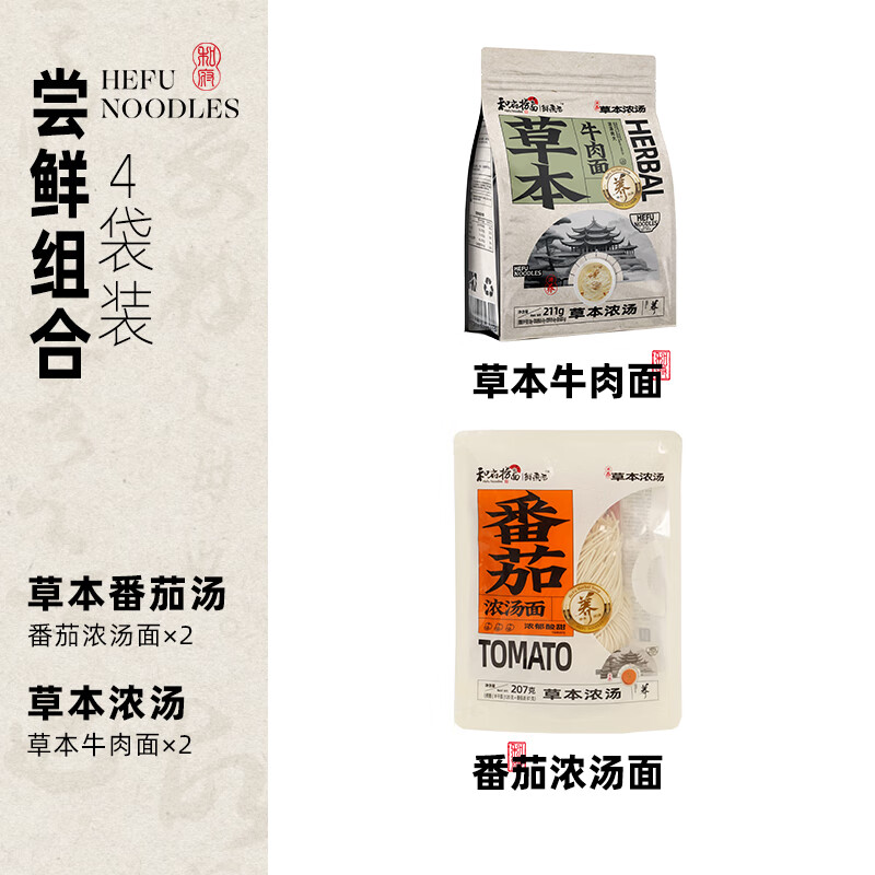 ¥59.9 和府捞面浓汤鲜煮牛肉面4袋组合装 光汤速食面方便拉面番茄牛肉面条cp 番茄浓汤面*2+草本牛肉面*2 89.9