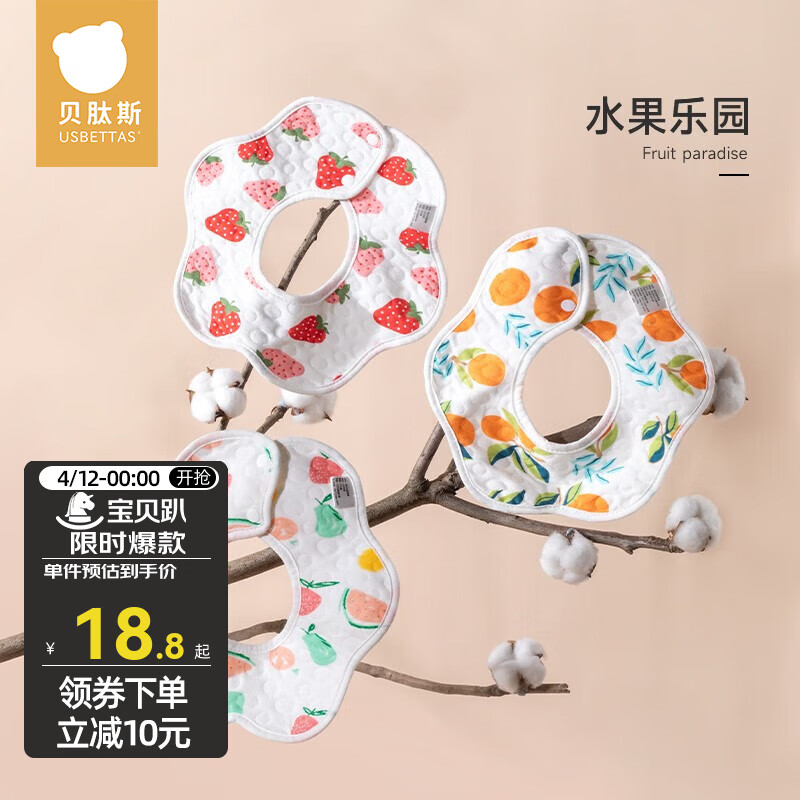 ¥10.8 贝肽斯口水巾婴儿口水围兜新生宝宝纯棉防吐奶柔软透气围嘴巾 水果乐园(花瓣款 3条装) 通用 28.8