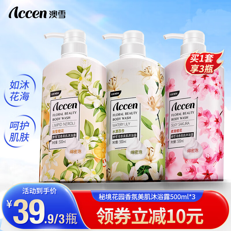 ¥29.9 澳雪(accen)香氛美肌花果香沐浴露套装男女士通用家庭装沐浴液 500ml*3百合+樱花+橙花 49.9