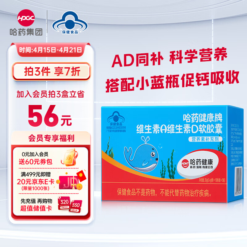 ¥38.3 哈药 维生素AD滴剂软胶囊50粒 复合维生素 维生素d3婴幼儿儿童孕妇一岁以上 促进补钙吸收添加核桃油 43.3