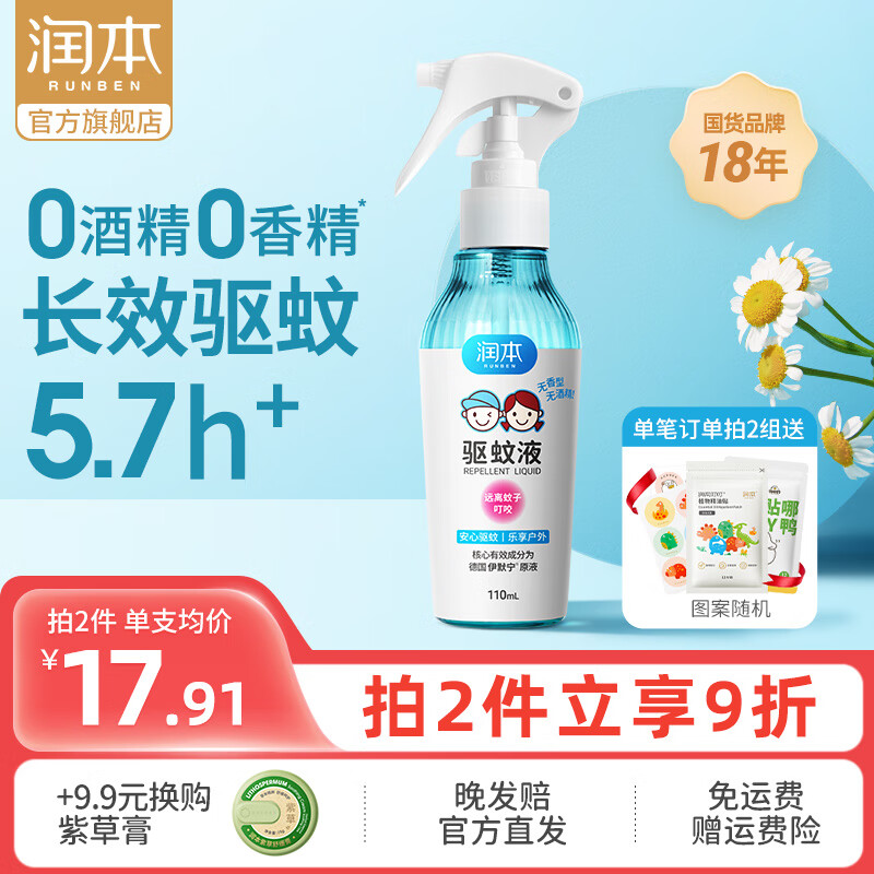 ¥12.9 润本(RUNBEN)驱蚊液婴儿童专用户外防蚊喷雾宝宝驱蚊花露水防蚊虫便携蚊怕水 110ml 1瓶 【0酒精0香精】 19.9