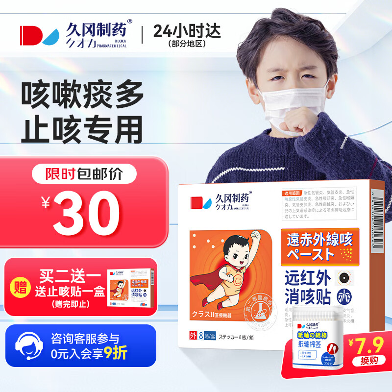 ¥25 久冈制药 止咳贴儿童远红外小儿感冒贴咳嗽干痒流鼻涕支气管炎咽喉肿痛咳喘化痰清肺穴位磁疗贴成人 1盒装 30