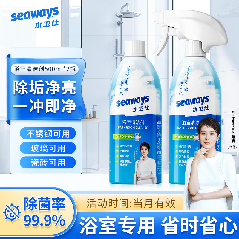¥15.9 水卫仕(seaways)浴室清洁剂 玻璃水垢清洁剂瓷砖浴缸水龙头花洒去垢除菌清洗剂 浴室净500ml*2 25.9