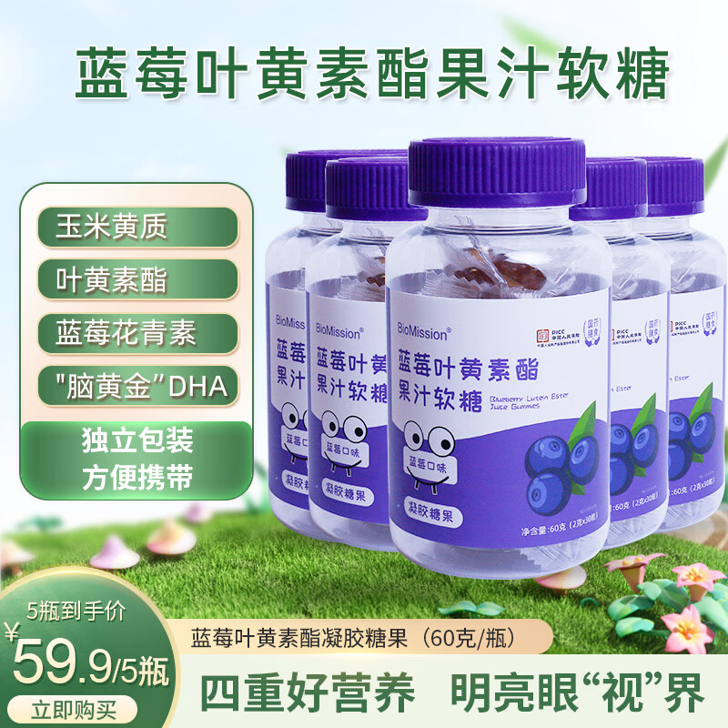 ¥56.9 拜曼蓝莓叶黄素酯果汁软糖成人蓝莓花青素大人小孩叶黄素青少年叶黄素酯果汁软糖 5瓶(全家优选组合) 76.9