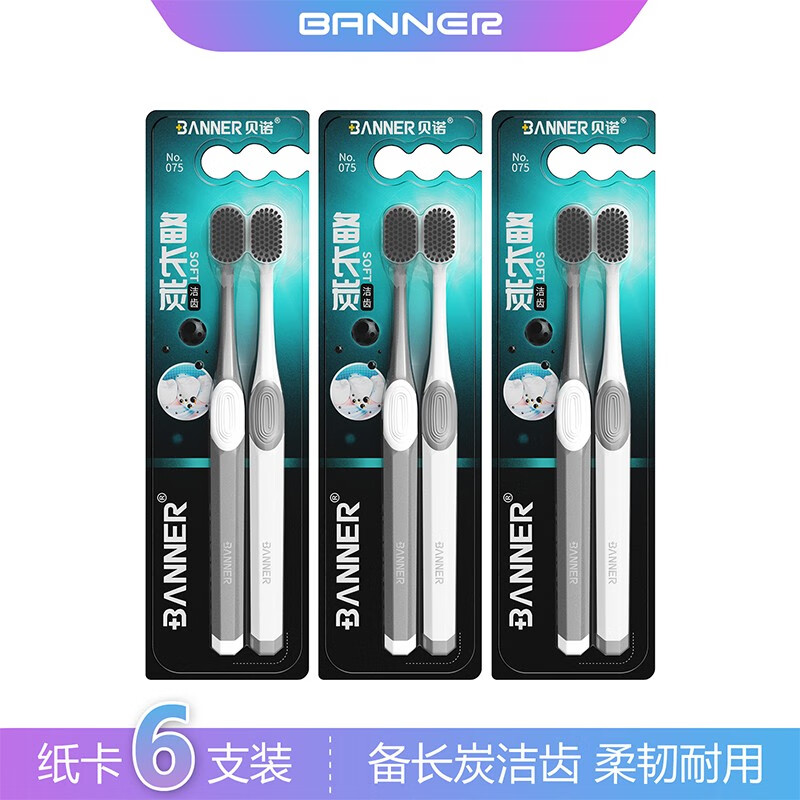 ¥9.9 贝诺(BANNER)2支装备长炭中软毛男女士专用牙刷成人家用刮舌苔清洁器双面刷头 【3盒】到手6支牙刷 11.9