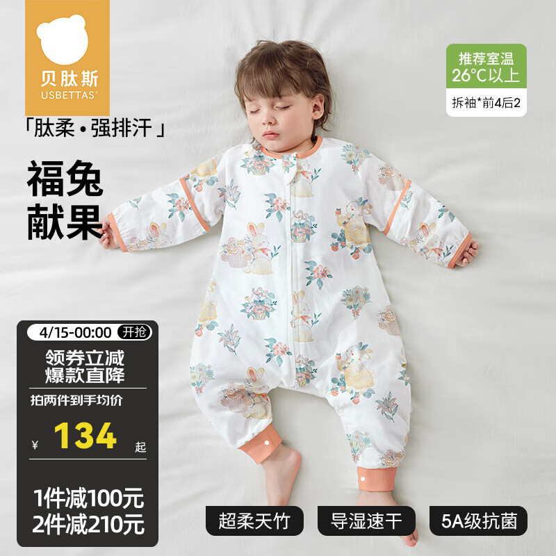 ¥119 贝肽斯肽柔婴儿睡袋春秋夏季纱布四季通用防踢被分腿新生宝宝儿童睡袋 【肽柔】初夏(前4后2 26℃以上)福兔 M码 建议身高80-95cm 239