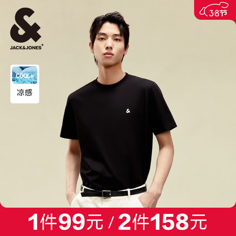 ¥99 杰克·琼斯(JACK&JONES)男装T恤男春夏万能T恤舒适男士短袖清凉多色上衣纯色水洗不易走形 黑色E40 175/96A/M 129