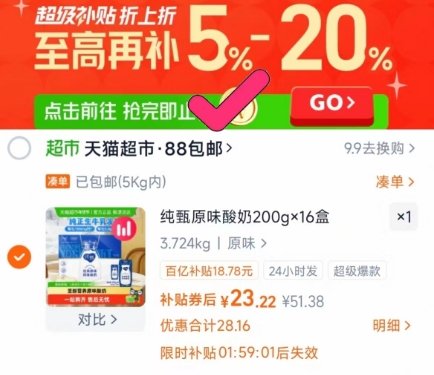 百亿补贴29.3元,领5.14元礼金,商品页价格下拉详情页-超级补贴跳转页面领 59-7元券拍,实付低至23.3元包邮;