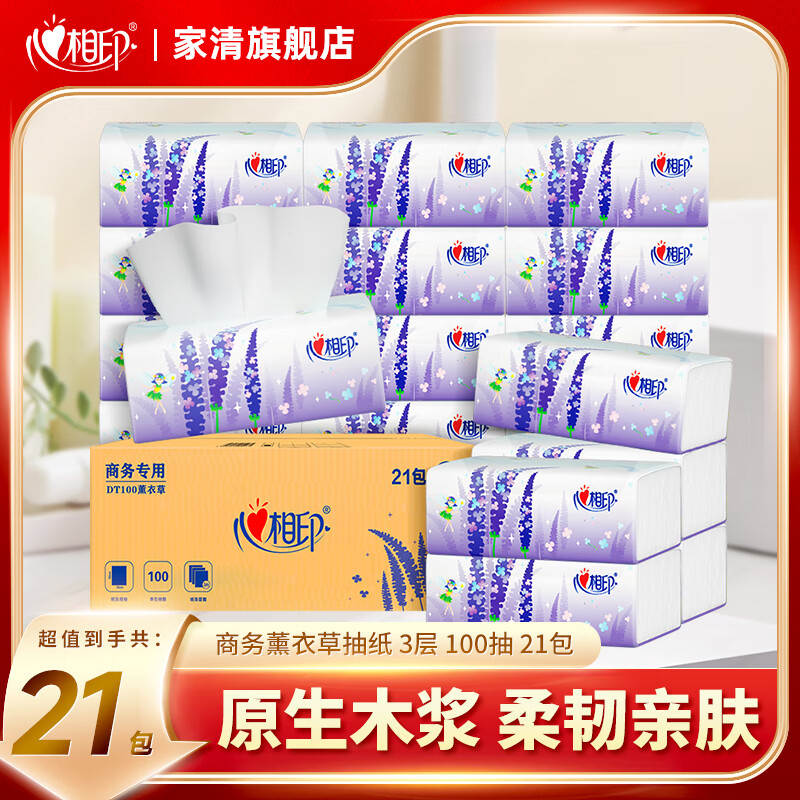 ¥24.9 心相印抽纸纸巾薰衣草亲家用餐巾纸餐厅商用纸面巾量贩实惠装亲肤无刺激 3层100抽 21包整箱 31.9