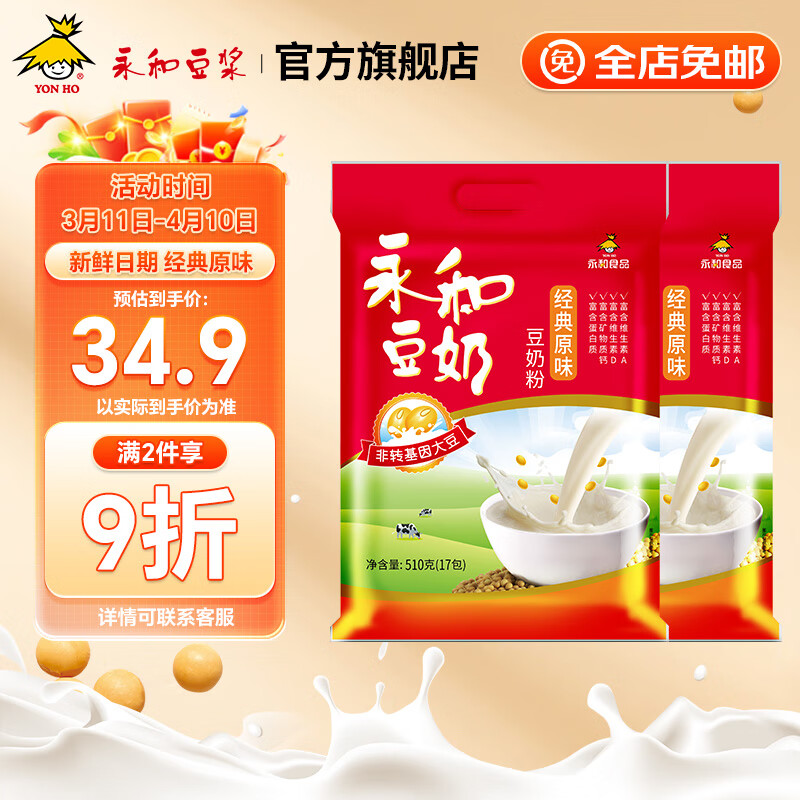 ¥29.9 永和豆浆经典好味道 豆奶粉 510g*2包(可冲34杯)早餐燕麦片搭档速溶冲饮 经典原味510g*2 39.9