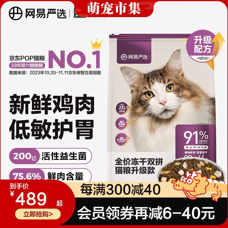 ¥509 网易严选猫粮【推荐】全价冻干双拼猫粮 主粮幼猫成猫无谷猫咪粮 【囤货】 2.0升级款10kg1袋 529