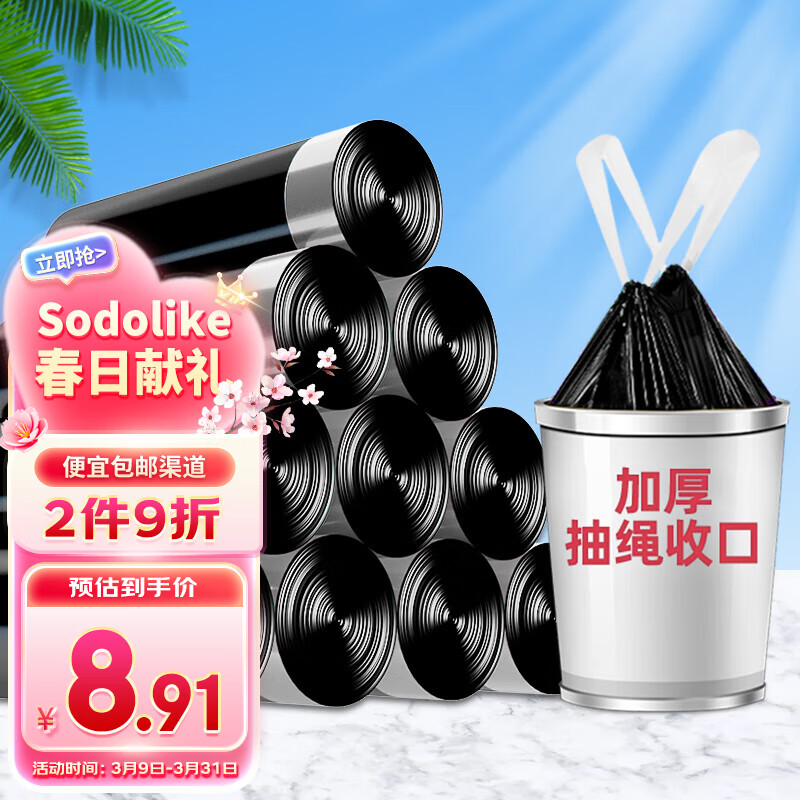 ¥8.9 Sodolike抽绳垃圾袋 厨房客厅专用一次性垃圾袋 清洁自收口垃圾袋 黑色100只*45*50cm 9.9