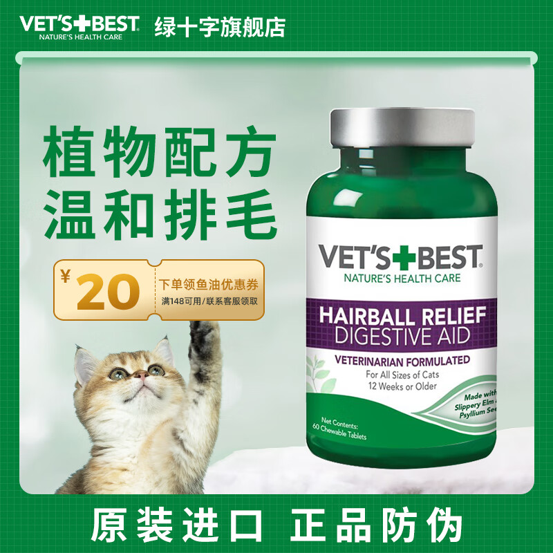 ¥62.75 VET'S BEST 绿十字猫草片维倍思进口去毛吐毛化毛球片猫咪化毛球3 猫草片60片*1瓶 68.75