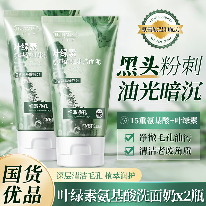¥18.9 HUNMUI叶绿素氨基酸洗面奶男女士黑头粉刺深层清洁油脸痘痘保湿补水洁面 氨基酸洗面奶 100g 【实惠装】2瓶 48.9