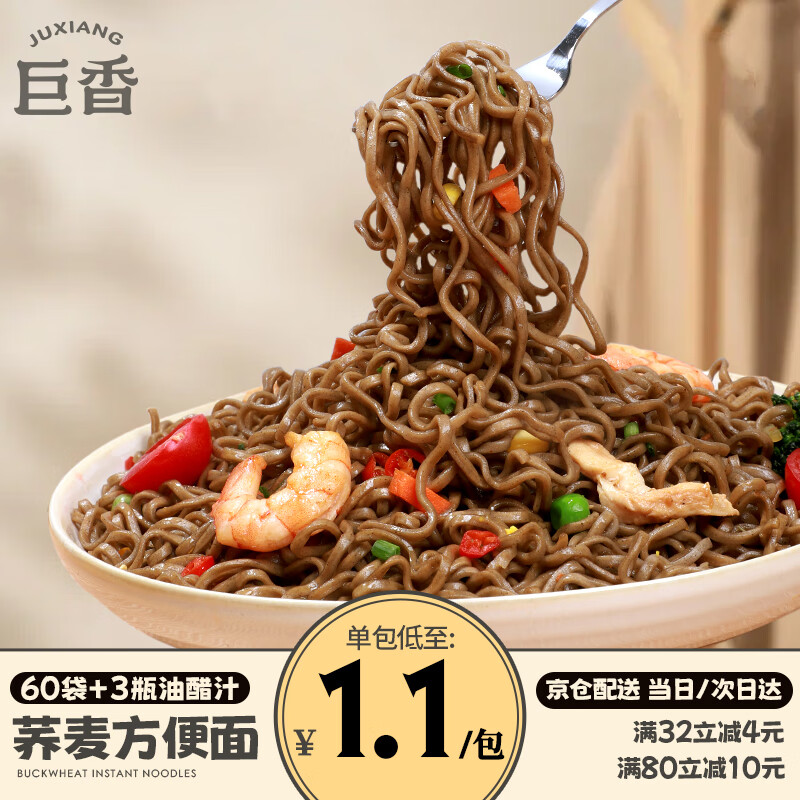 ¥41.9 巨香 0脂肪荞麦面方便面带调料包非油炸乔麦杂粮面条100%荞麦面挂面 【60袋荞麦面+3瓶0脂油醋汁】 69.9