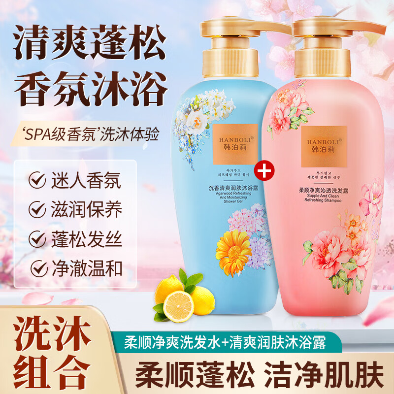 ¥18.9 HANBOLI柔顺洗发水香氛清爽顺滑头皮油腻清洁花香焗油烫染洗护男女 香氛洗发水+香氛沐浴露 500ml 1瓶 48.9