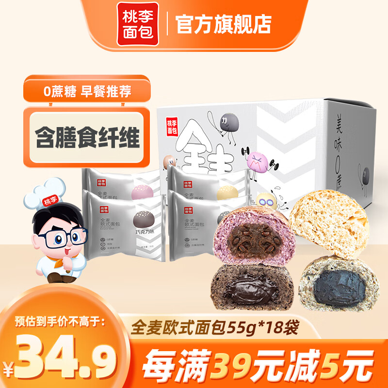 ¥34.9 桃李全麦面包夹心欧包低脂0蔗糖紫薯红豆巧克力馅料早餐代餐休闲零食 4种口味混合(内含18袋) 990g 39.9