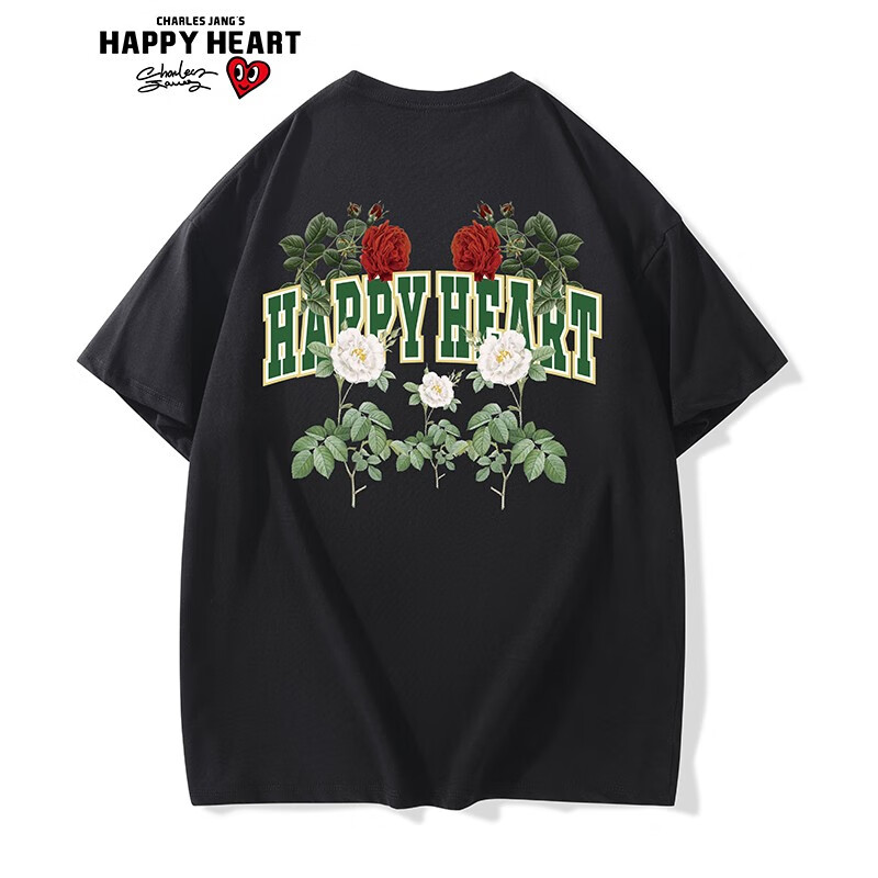 ¥69 查尔斯桃心夏季薄款纯棉玫瑰字母印花休闲潮流百搭街头风短袖T恤男男女同款 黑色 XL 99