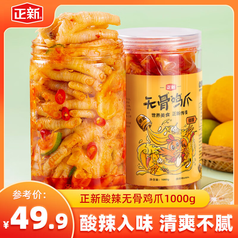 ¥39.9 正新无骨鸡爪柠檬酸辣网红罐装脱骨泡椒凤爪2斤大份量零食去骨鸡爪子 重辣罐装1000g 49.9